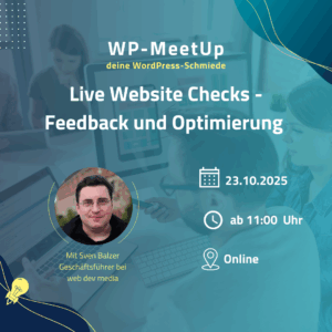 WordPress Meetup: Live Website Checks – Feedback & Optimierung Liebe WordPress-Bastler:innen, Anwender:innen und Interessierte, wir laden euch herzlich ein zu ... 23 Okt. 11:00 - 12:00 OnlineOnline