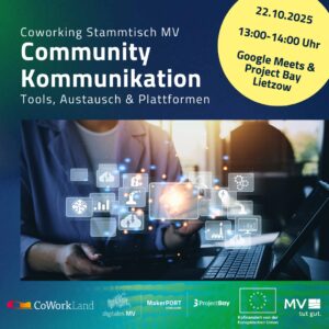 Coworking Stammtisch MV – Thema: Community-Kommunikation Community-Kommunikation im Coworking – Tools, Austausch & Plattformen Coworking lebt vom ... 22 Okt. 13:00 - 14:00 Project BayBoddenstraße 64, 18528 Lietzow