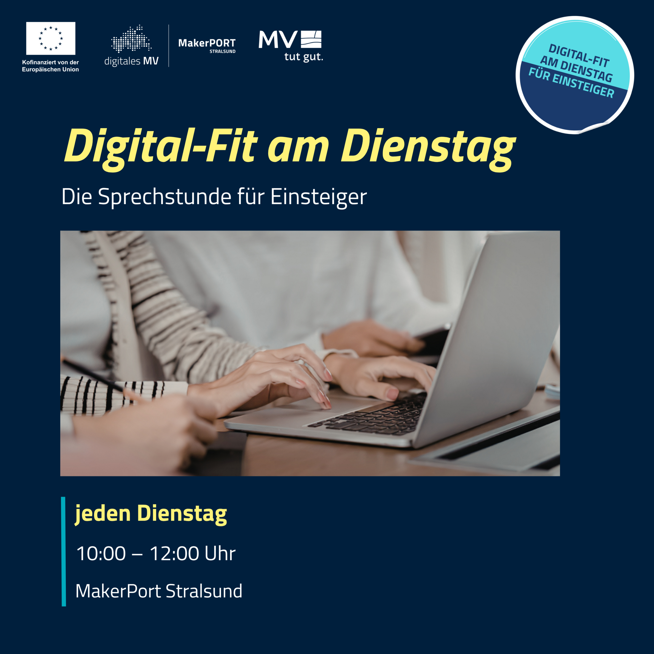 Jeden Dienstag von 10 bis 12 Uhr im MakerPort kannst du deine eigenen Fragen und Arbeiten zu digitalen Themen mitbringen – von Geräten über Apps, Social Media, KI bis hin zu Sicherheit und Datenschutz.