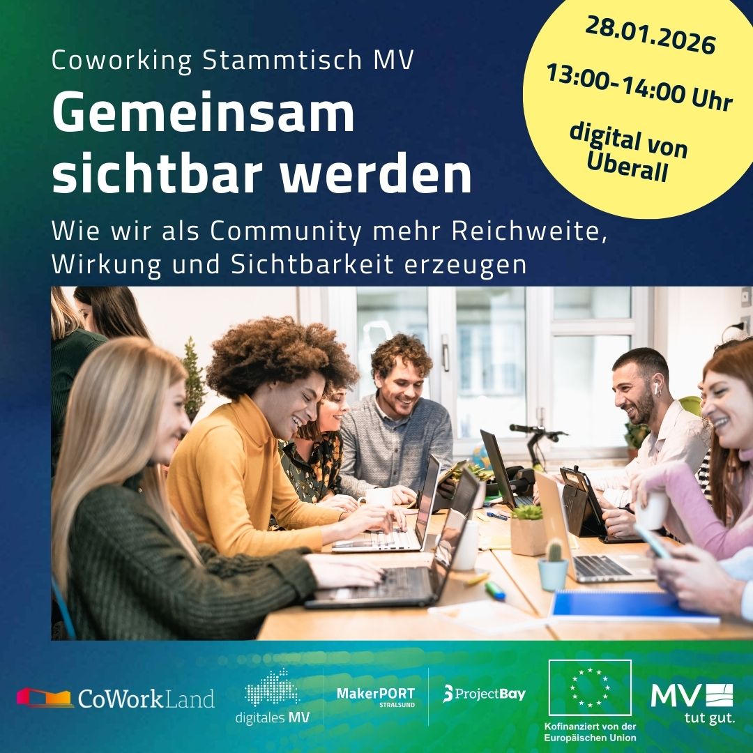Ziel ist es, Ansätze zu entwickeln, wie Coworking-Anbieter:innen in Mecklenburg-Vorpommern durch abgestimmte Kommunikation, geteilte Reichweite und gemeinsame Präsenz sichtbarer werden – sowohl online als auch vor Ort.