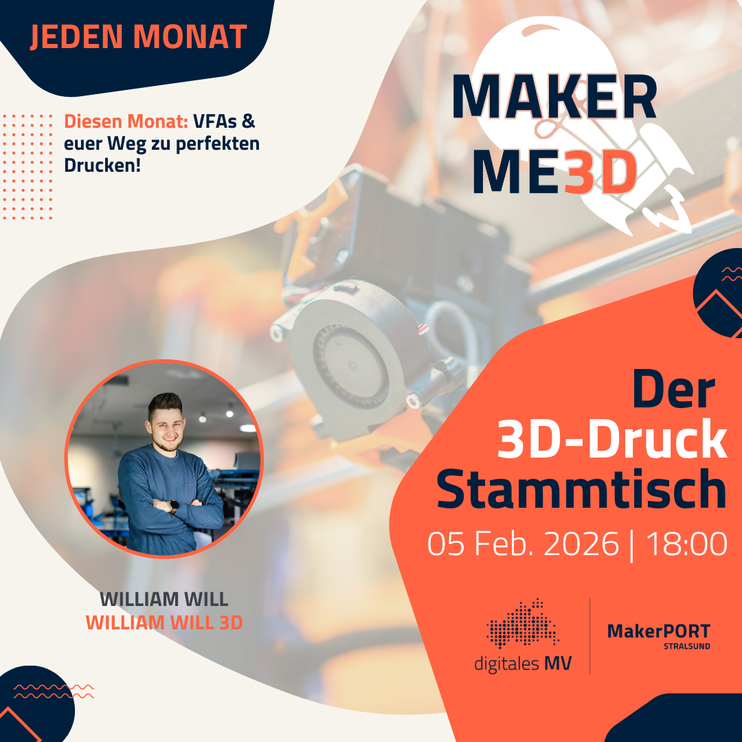 Kommt zum MakerME3D, stellt eure Projekte vor, tauscht euch aus und lasst uns gemeinsam herausfinden, wie wir die VFAs minimieren und die Qualität unserer 3D-Drucke weiter verbessern können:
