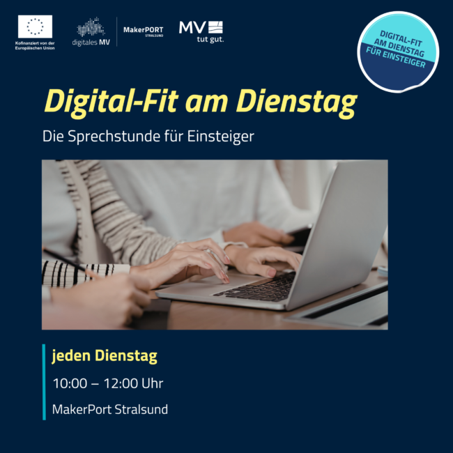 Du möchtest den Einstieg in die digitale Welt schaffen, weißt aber nicht, wo du anfangen sollst? Dann ist unsere Digital-Sprechstunde am Dienstag genau das Richtige für dich. Jeden Dienstag von 10 bis 12 Uhr im MakerPort kannst du deine eigenen Fragen und Arbeiten zu digitalen Themen mitbringen – von Geräten über Apps, Social Media, KI…